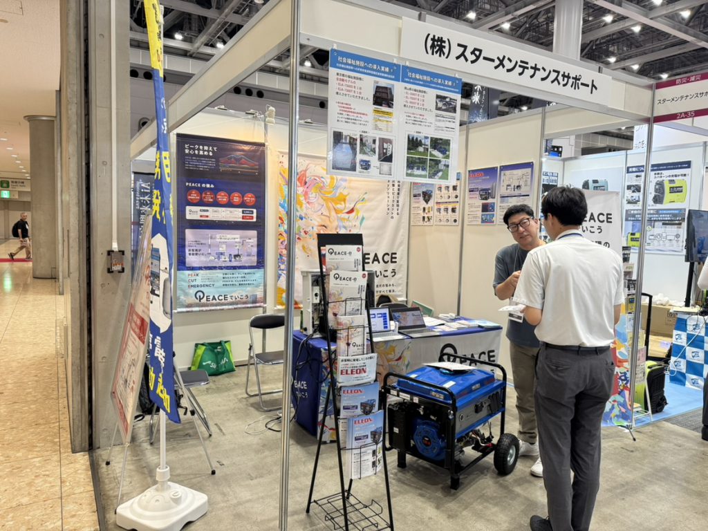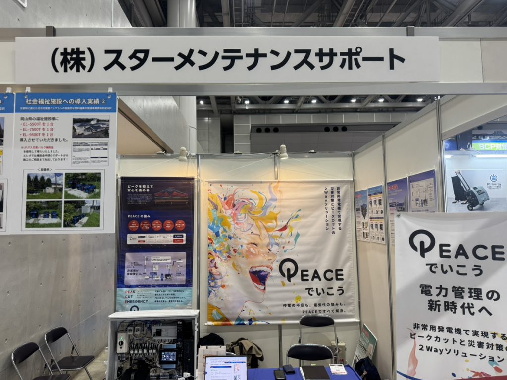 危機管理ということから、防災・減災・BCPに至るまでいろいろな企業が参加され、私たちスターメンテナンスサポートも「PEACE」を展示させていただきました!
