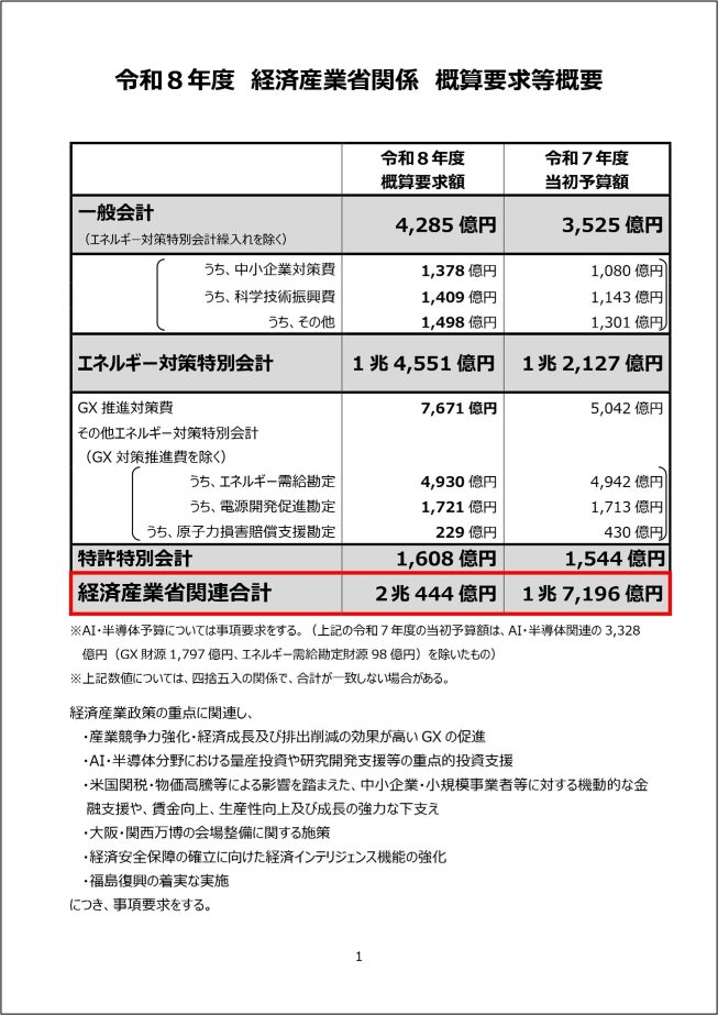 ご覧いただくと分かるように、経済産業省関連合計は前年から3,248億円の要求額増加。