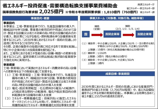 こういった課題の一つを解決するべく、省エネルギー投資促進・需要構造転換支援事業費補助金と銘打って進められているのが、以下の補助金です。